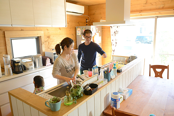 最初は夫妻の趣味のスペースにと考えた土間だが、今は愛娘の紗英ちゃんの遊び場になっている。お母さんがキッチンに立っていても、すぐ目の届くところにいるから安心だ。紗英ちゃんが過ごすスペースにはカーペットを敷いてあるから、リビングとの行き来も楽ちん。子供部屋としてちゃんと機能している。もともと子供部屋は2階に用意されているが、「ここで遊ばなくなったら、自分の部屋に行けばいいんですよ」とOさんは我が子を見守る。